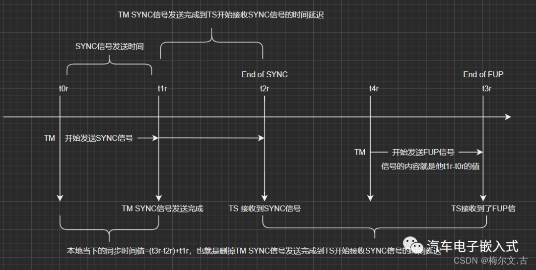 第一步是TM发送SYNC信息,第二步是发送FUP(Timeadjustment message (Follow-Up),时间调整信息),第三步. 最后在Slave方,我们就可以计算出本地当下的同步时间值=(t3r-t2r)+t1r