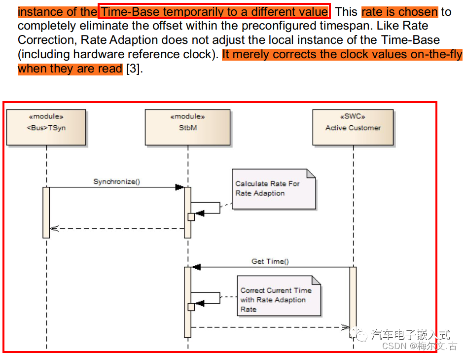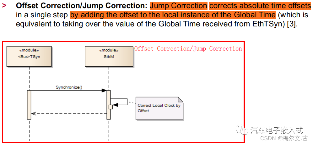 时间纠正机制:Tv-Tvsync 保存从上次接收到的 Global Time 所经过的时间量。但它会受到本地硬件时钟漂移的影响。当从总线接收到新的 Global Time 时,Global Time 的 local instance 和接收到的 Global Time之间可能存在偏移。