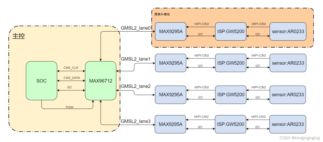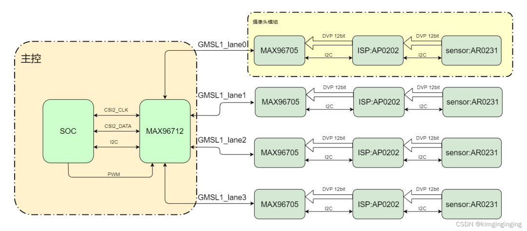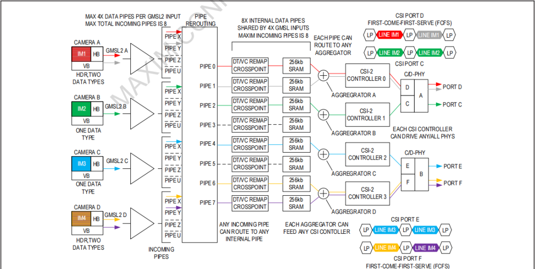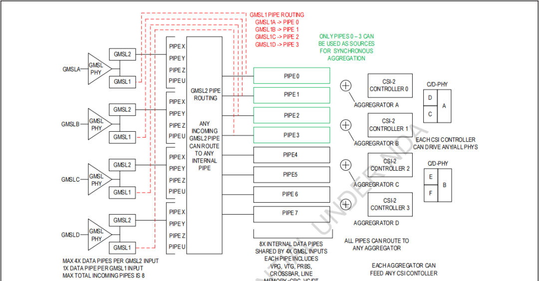 GMSL1模式下,每个串行器不能包含多个pipe,且进入max96712后也不能随意搭配内部pipe,固定连接如上图红色部分:
