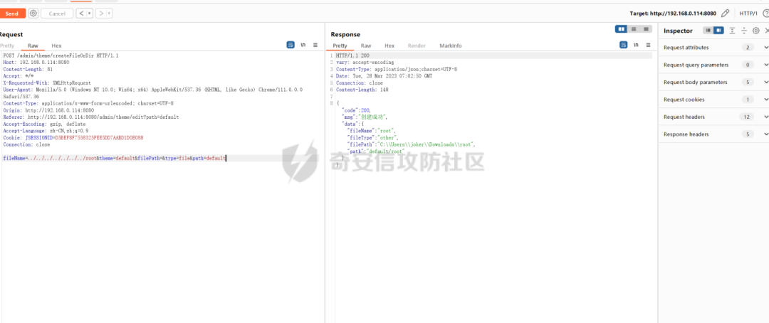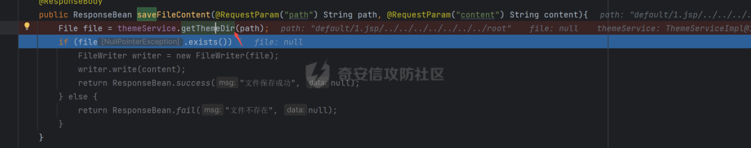 结合前面的目录穿越,尝试了写入文件时能不能,但是注意到这里对文件路径进行了校验,通过获取themeDir的路径进行判断是否存在,不存在会直接返回文件不存在