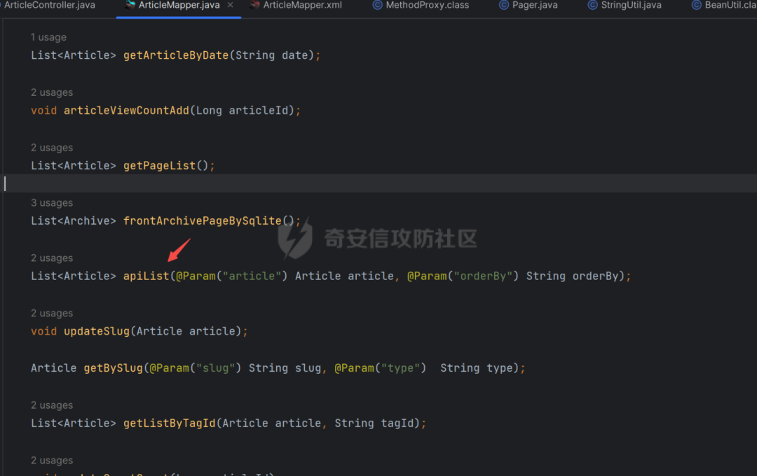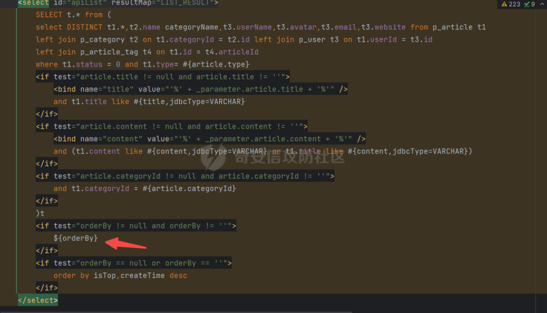 熟悉mybatis的师傅应该都知道造成sql注入的成因,这里直接全局去搜索$,找到了如下:com/perfree/mapper/ArticleMapper.java