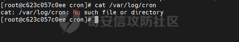 接上面的利用链重命名文件,进入docker查看,已经成功写入计划任务,但是在查看计划任务执行的日志文件时发现并不存在该日志文件