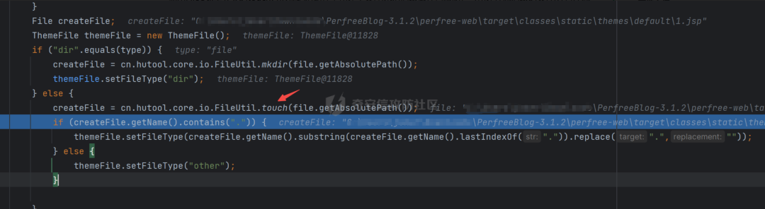 调用FileUtil工具类的touch方法在绝对路径下创建了文件,未对后缀做任何限制,可创建任意后缀的文件,并且注意到未对..和/进行过滤,可以进行目录穿越创建文件