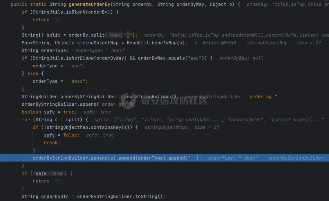 这里是对获取到的参数进行处理,根据前面所知,orderBy参数可控且是可能存在的注入点,对获取到的数据以','进行分割,并对数组进行了白名单匹配,若数组中的数据不在白名单中就直接返回为空