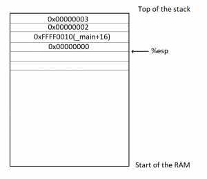 根据约定,程序从_main标签开始执行,这时会在 Stack 上为main建立一个帧,并将 Stack 所指向的地址,写入 ESP 寄存器。后面如果有数据要写入main这个帧,就会写在 ESP 寄存器所保存的地址。