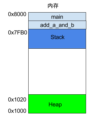 }上面代码中,main函数内部调用了add_a_and_b函数。执行到这一行的时候,系统也会为add_a_and_b新建一个帧,用来储存它的内部变量。也就是说,此时同时存在两个帧:main和add_a_and_b。一般来说,调用栈有多少层,就有多少帧。