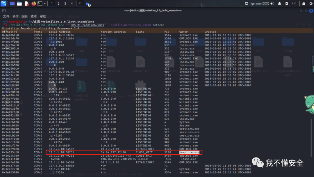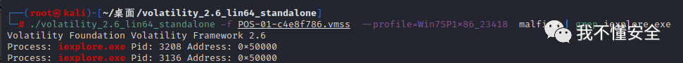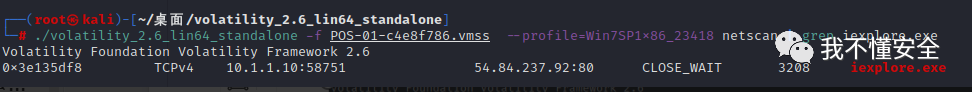 ./volatility_2.6_lin64_standalone -f POS-01-c4e8f786.vmss --profile=Win7SP1x86_23418 netscan暂时看到iexplore.exe ,该进程贯穿核心,而后我们继续往下看,尝试过滤一下恶意代码扫描结果
