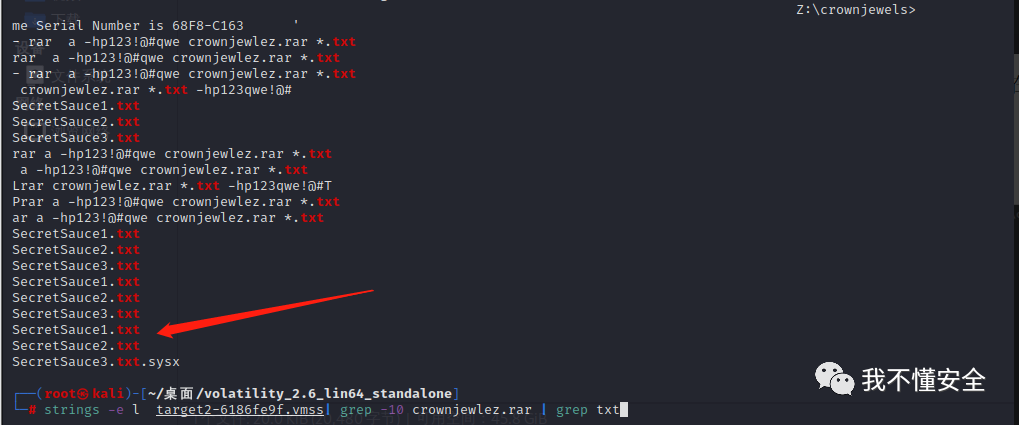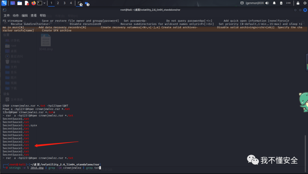 ./volatility_2.6_lin64_standalone -f target2-6186fe9f.vmss --profile=Win7SP1x86_23418 memdump -p 3048 -D ./rar直接搜索关键字,按照txt格式搜索就可以