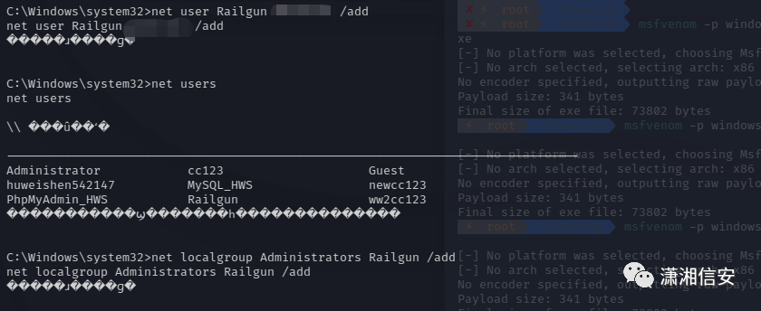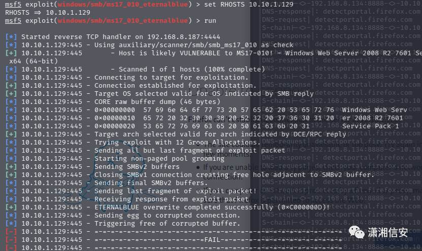 接着我用msfvenom生成bind_tcp的后门,本机Windows通过proxifier(或SocksCap64)连到DMZ的8888端口进而连接SQL Server的3389并开启文件共享,然后执行后门