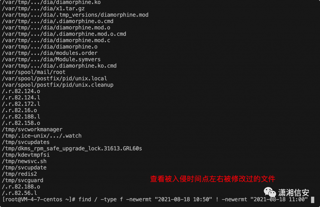 在清理掉挖矿进程后,cpu占用会减少,方便后续的操作。同时已经清理了cron定时任务后不会一段时间后又重启挖矿。根据云镜告警的命令执行时间,通过find命令查找最近被修改过的文件。