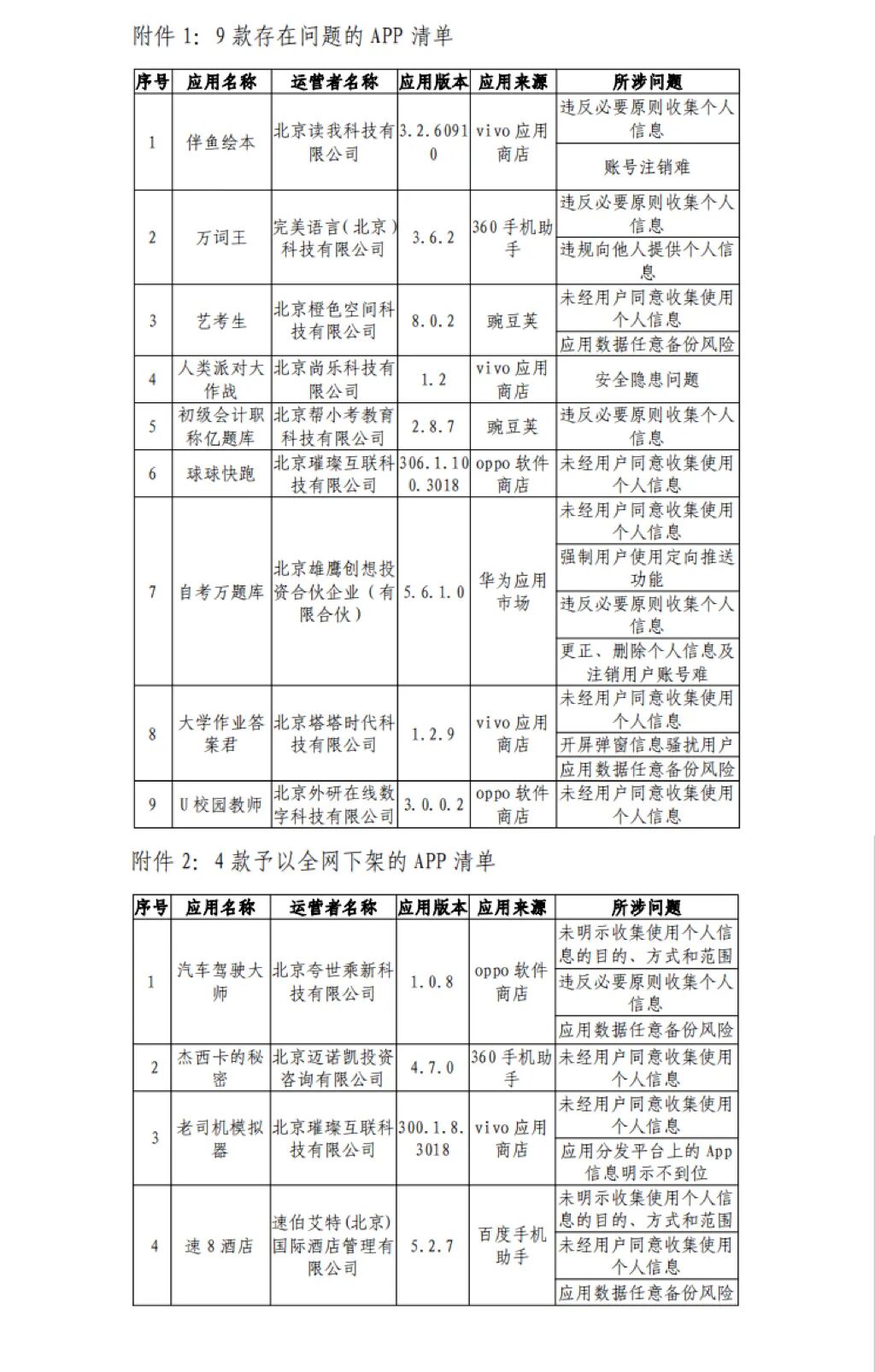 一、近期,北京市通信管理局通过抽测发现本市部分APP存在“违反必要原则收集个人信息”“未明示收集使用个人信息的目的、方式和范围”等侵害用户权益和安全隐患类问题。截至目前,尚有9款APP未整改或整改不到位,现予以公开通报(详见附件1)。