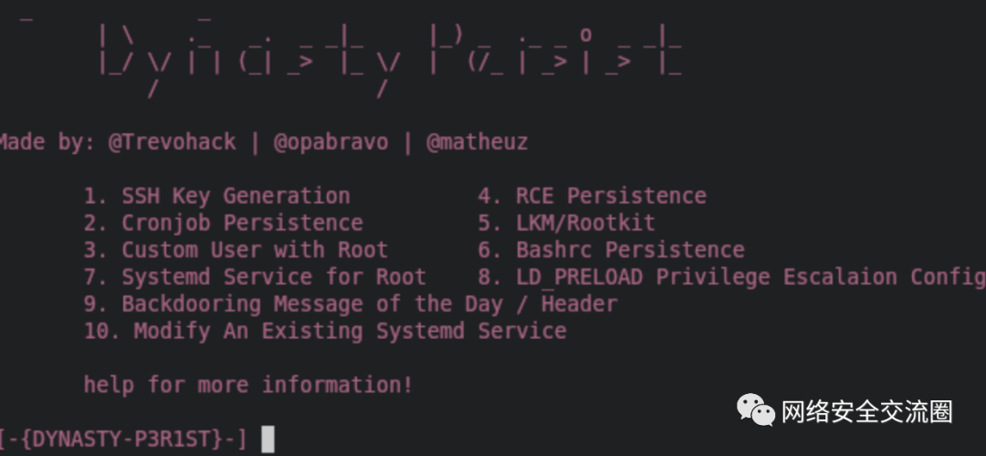 功能强大且用途广泛的 Linux 持久性脚本,专为各种安全评估和测试方案而设计。此脚本提供了一组功能,这些功能演示了在 Linux 系统上实现持久性的不同方法。