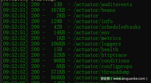 路径 是否默认启用 功能描述/auditevents 是 显示当前应用程序的审计事件信息/beans 是 显示一个应用中所有Spring Beans的完整列表/conditions 是 显示配置类和自动配置类的状态及它们被应用或未被应用的原因/configprops 是 显示一个所有@ConfigurationProperties的集合列表/env 是 显示来自Spring的 ConfigurableEnvironment的属性/flyway 是 显示数据库迁移路径(如果存在)/health 是 显示应用的健康信息(当使用一个未认证连接访问时显示一个简单的’status’,使用认证连接访问则显示全部信息详情)/info 是 显示任意的应用信息/liquibase 是 展示任何Liquibase数据库迁移路径(如果存在)/metrics 是 展示当前应用的metrics信息/mappings 是 显示一个所有@RequestMapping路径的集合列表/scheduledtasks 是 显示应用程序中的计划任务/sessions 否 允许从Spring会话支持的会话存储中检索和删除用户会话/shutdown 否 允许应用以优雅的方式关闭(默认情况下不启用)/threaddump 是 执行一个线程dump/heapdump 是 返回一个GZip压缩的hprof堆dump文件/jolokia 是 通过HTTP暴露JMX beans(当Jolokia在类路径上时,WebFlux不可用)/logfile 是 返回日志文件内容(如果设置了logging.file或logging.path属性的话),支持使用HTTP Range头接收日志文件内容的部分信息/prometheus 是 以可以被Prometheus服务器抓取的格式显示metrics信息直接用spring收集好的目录进行目录扫描。