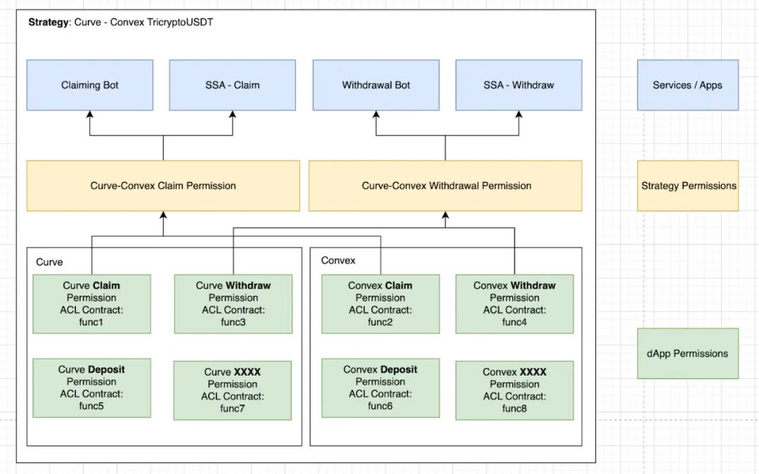 在新架构下执行 Curve & Convex Farming 策略以及实现策略权限检查的过程如下图所示:首先由各类细颗粒度的 deposit/withdraw/claim 权限组成 Curve/Convex dApp 权限,再由dApp的权限自由组合成策略权限,通过将 Curve/Convex deposit/withdraw/claim 策略权限授权给 Proxy Deleage,最终由 On-chain/Off-chain bot / SSA 执行 Curve & Convex Farming 策略,在执行策略内的每一笔交易时,它都会由对应的 ACL 进行策略权限的检查,确保 bot 在安全权限内执行。因此,以 Cobo Safe 为底层可以实现灵活组合的资管策略,实现资产、收益协议自由组合的参数级安全控制。