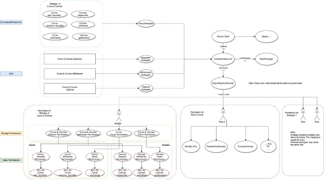 这本质上是一种设计模式的改进,与目前主流设计模式不同,在这种架构中,将「人」与「特定权限」的关系作为程序架构的核心,可通过函数级别的参数控制,所有的操作都可以抽象为「人」和特定项目的特定权限的绑定/移除,然后通过智能合约(Cobo Argus 中智能合约被命名为 Authorizer) 实现单个操作的绑定/移除,因此,每新增一个 DeFi 策略需求,都可直接通过 Authorizer 将不同的权限操作配置给「Role」,而无需重写全部智能合约的代码。