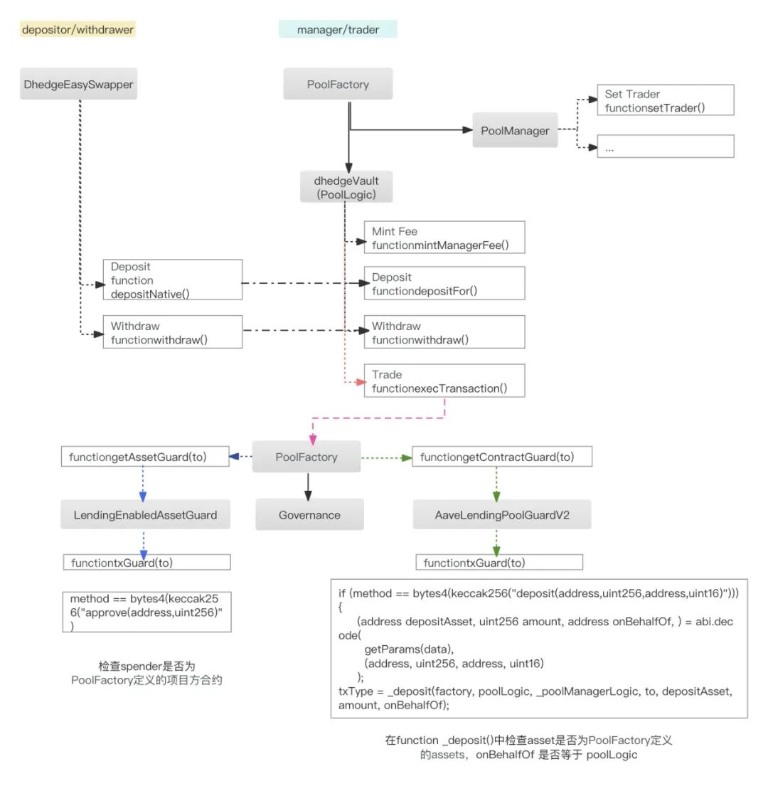 在 dhedge 中,用户是通过创建 PoolFactory 合约来进行资管的,每个 Vault 是一个单独的合约,以代码的形式预定义了该策略指定支持的白名单资产和允许交互的收益 DeFi 协议。