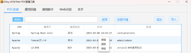 - 1、显示当前poc列表。右键poc可以删除、编辑。也可以导出分享poc。