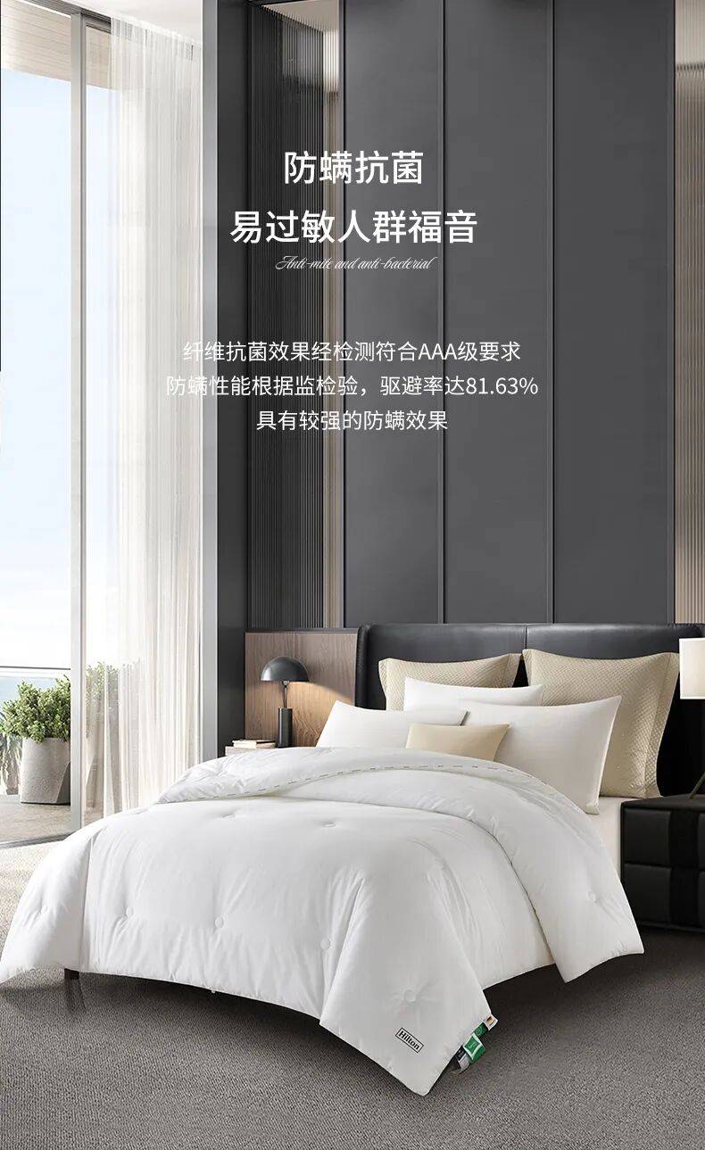 如果这 1/3 的时间里,你睡得不好,那第二天的心情瞬间就不美丽了,心情暴躁、反应迟钝、易怒,影响工作不说~脸色蜡黄暗沉,看上去超级憔悴,好像一下子老了好几岁,再贵的化妆品都补不回来~想想睡了这么多年,在小编记忆中睡的舒服的一次就是,旅途中住过一次五星酒店Hilton的总统套房。不得不说五星级的床品是真滴舒服,面料亲肤顺滑、没有一丝异味~身体一沾被褥,随着填充物慢慢下陷,肩部、颈部,背部的肌肉顺势放松,感觉这一天的压力都消散了,然后一觉到天亮。。。今天为大家带来了一条【希尔顿Hilton酒店授权】抑菌除螨被;OEKO-TEX® STANDARD 100认证,安全标准远超国际执行标准。![]()