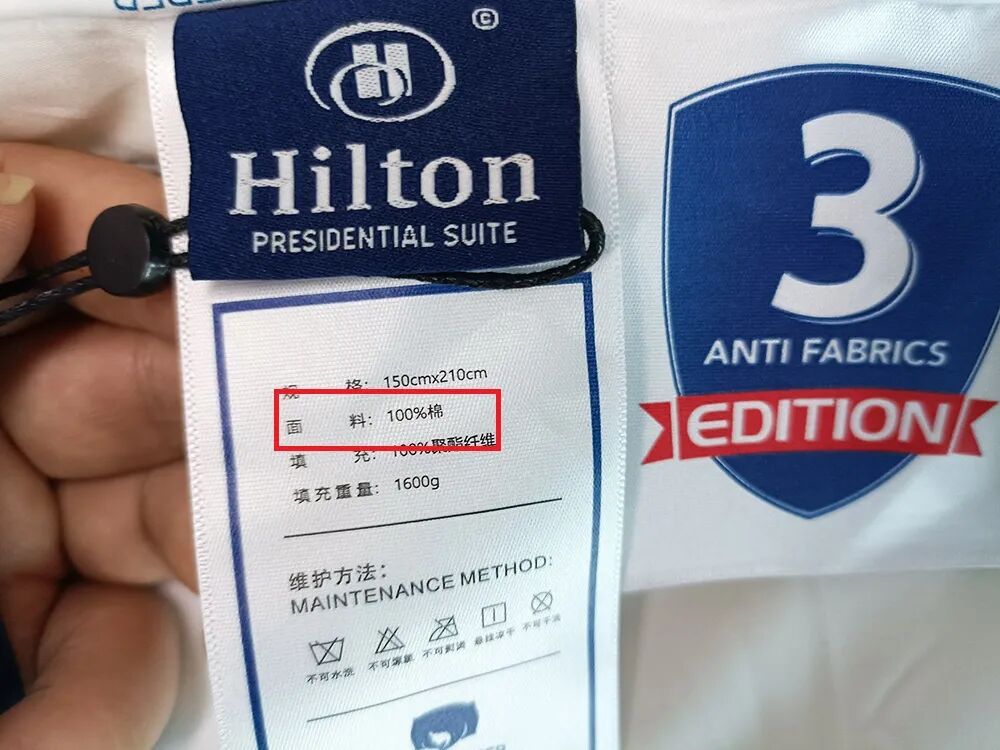 为了确保产品质量,希尔顿还特意个被子增加了唯一识别编码,每个被子的编码都是独立的;![]()