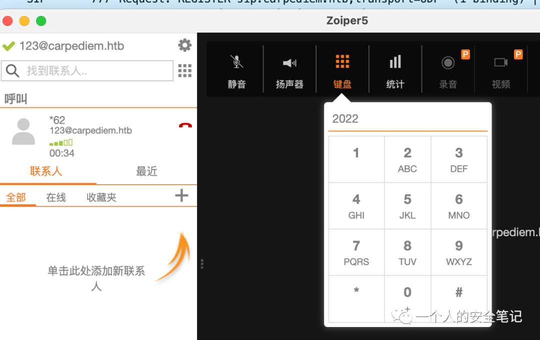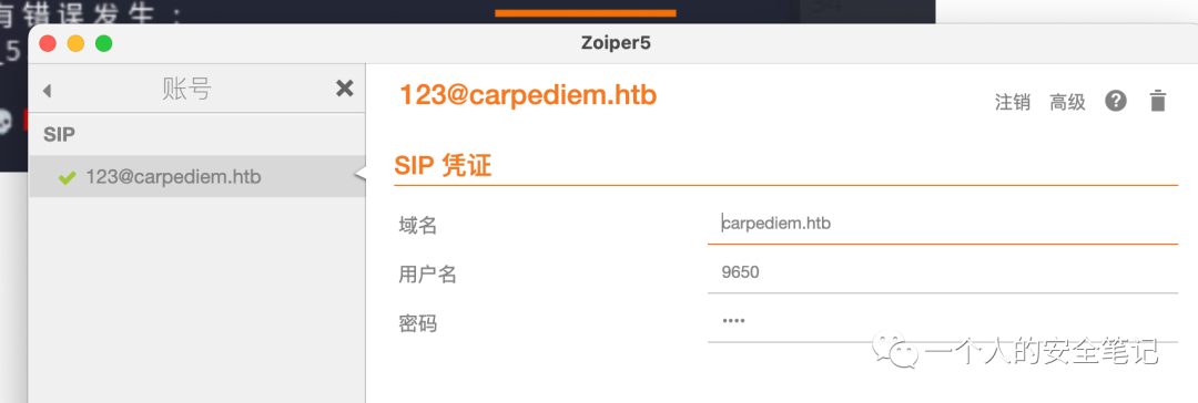 创建一个免费的帐号并使用 SIP 凭证登录方式连接 carpediem.htb 服务器。