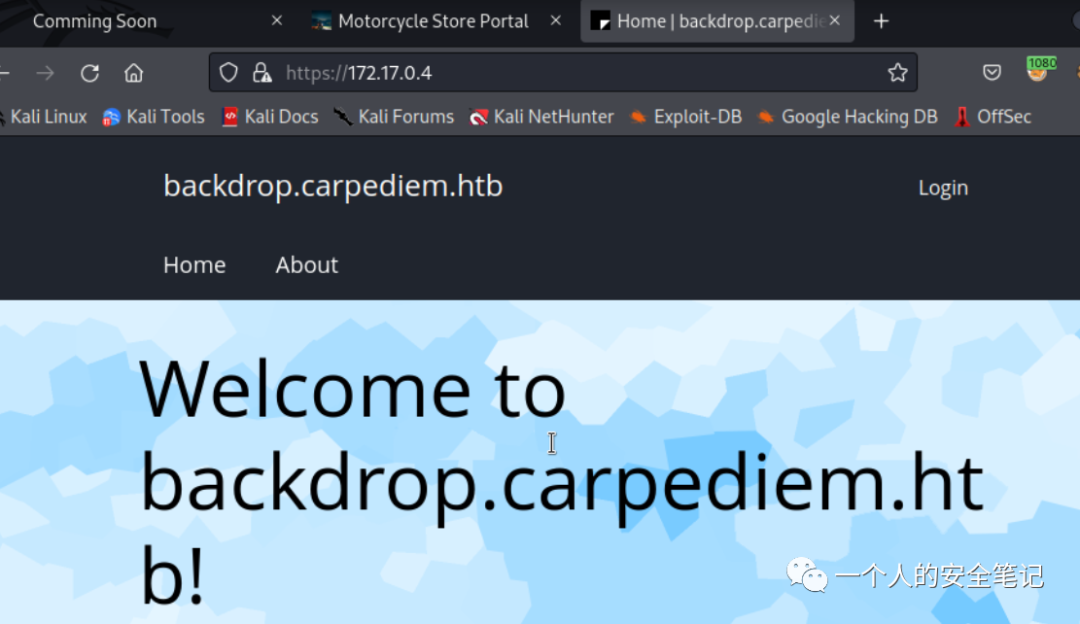 在 172.17.0.4 上运行着一个 Web 服务,访问它得到一个新的域名 backdrop.carpediem.htb,在页面中也能知道应用使用的 CM 系统叫 Backdrop CMS。