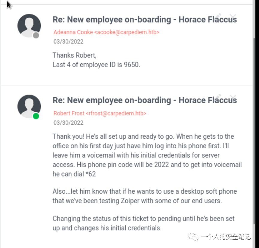 谢谢!他已经准备就绪,随时可以出发。当他第一天到办公室时,让他先登录自己的手机。然后给他留个语音信箱,告诉他服务器访问的初始密码。进入服务器。他的手机密码是 2022,要进入语音信箱他可以拨打 *62 另外......让他知道,如果他想使用桌面软电话,我们已经对一些最终用户进行了 Zoiper 测试。将此单据的状态更改为待处理,直到他完成设置并更改初始凭证并更改他的初始凭证。所以要得到服务器密码需要用 Zoiper 进行拨号,因为我的 kali 是 arm64 所以安装不了,转到 Macos 上去使用客户端。
