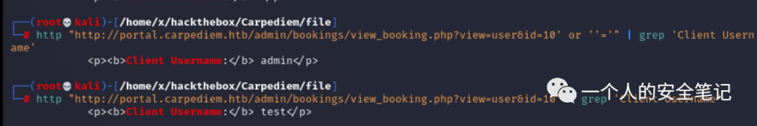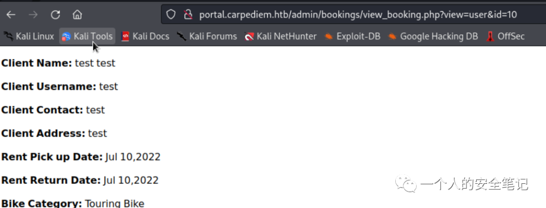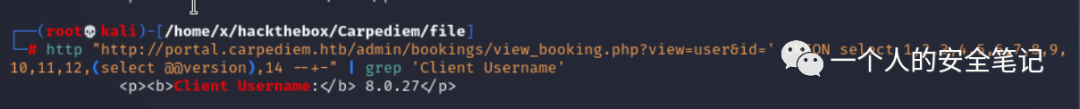 http://portal.carpediem.htb/admin/bookings/view_booking.php?view=user&id=10简单测试后确认 SQL 语句的回显内容,通过利用 order by 语句判断 SQL 查询字段整体长度后,构建连接查询语句就能获取到预期结果。