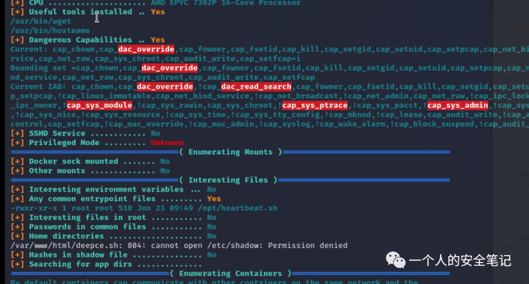 成功获得了这台容器的 root 权限,接着就是找找看有没逃逸至物理机的路径了。将容器逃逸检查脚本 deepce.sh[6] 传递至容器中执行: