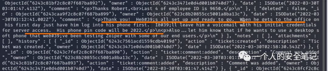 { "_id" : ObjectId("6243c69d1acd1559cdb4019b"), "username" : "svc-portal-tickets", "password" : "$2b$10$CSRmXjH/psp9DdPmVjEYLOUEkgD7x8ax1S1yks4CTrbV6bfgBFXqW" }在 tickets 库中能找到很多记录详情,留意到其中有提到语音信箱,手机 pin code 为 2022,语言信箱登录名是 9650。