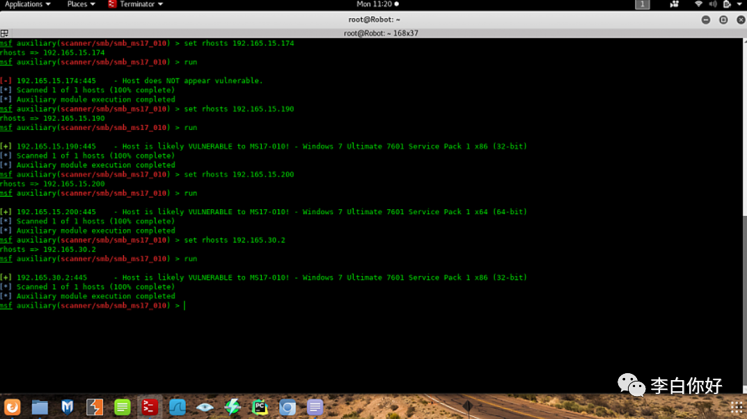 下面就重点对这几台机器入手,使用msf扫描下看是不是都存在smb漏洞(ms17_010),这漏洞在局域网真的超级好用,扫描截图