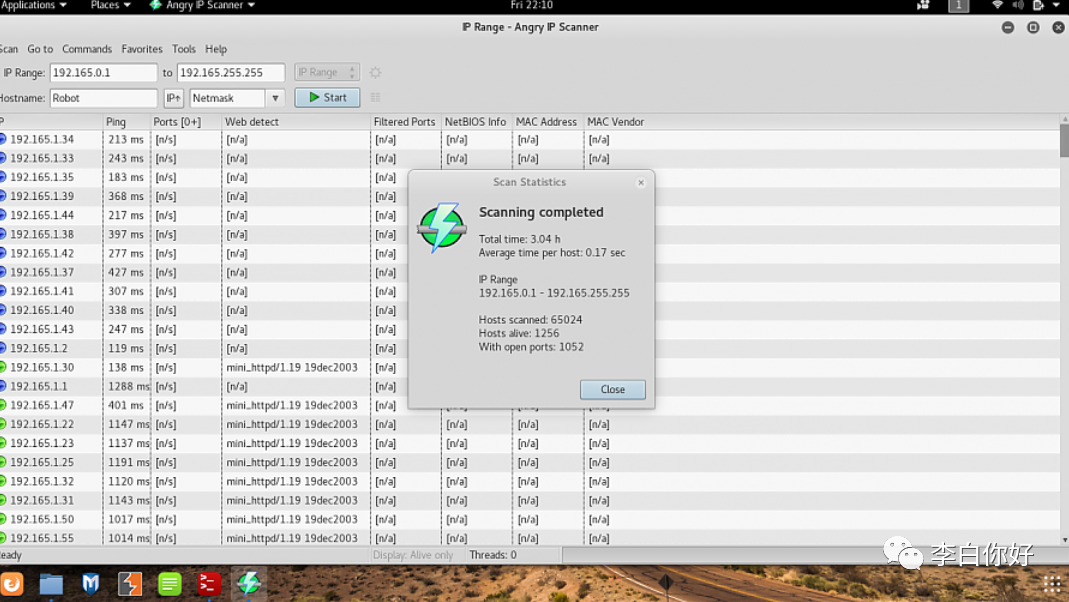 这样笔记本通过无线wifi就可以对IP段进行扫描了,我这使用的扫描软件是Angry IP Scanner,图形界面用起来很爽,而且速度也快