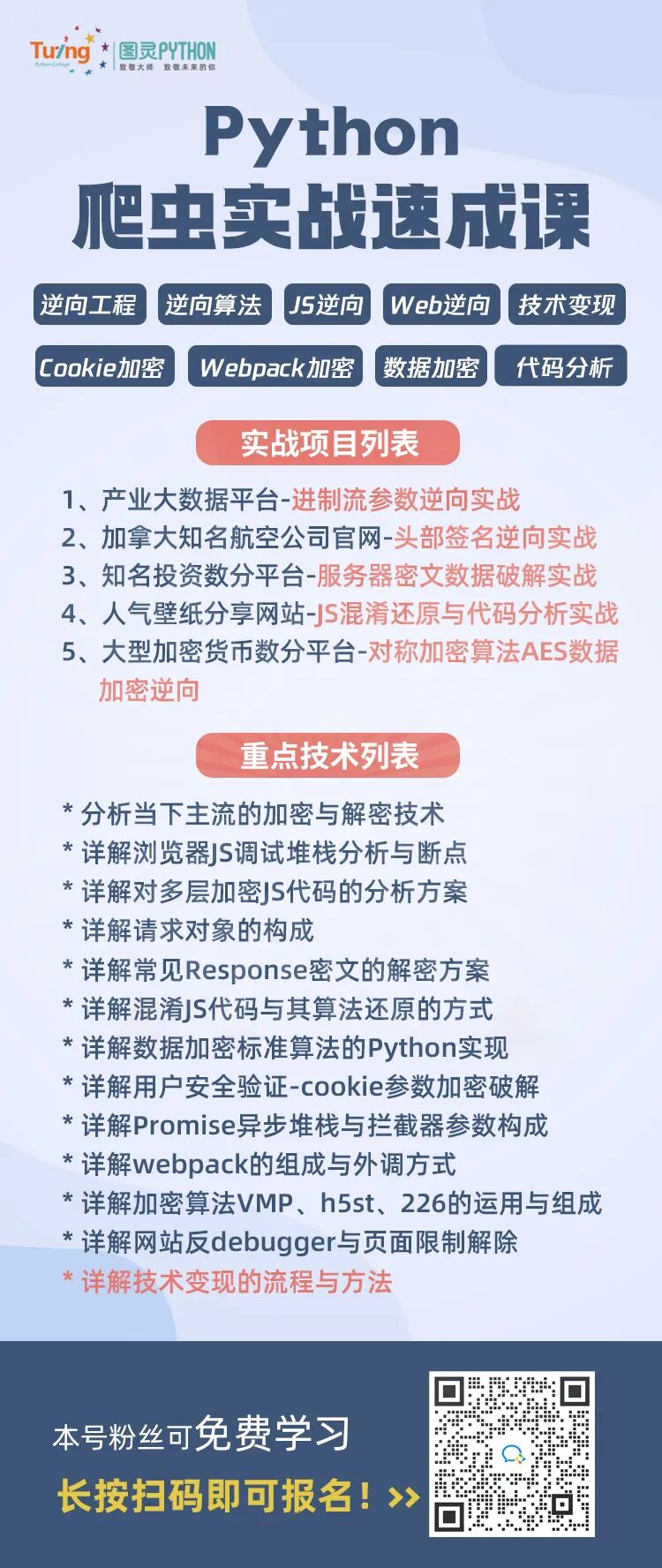 官方特训费299元,本号粉丝有福利,立即报名可免费学习!这是一套专讲爬虫逆向攻防的高阶技术实战课,迄今为止已帮助近三万学员快速进阶。本次课程将由国际大数据竞赛获奖大佬亲身指导,带领大家进行一线大厂高阶技术体系+APP\小程序\Web逆向攻防实战+技术变现路径指导的综合速成训练!![]()