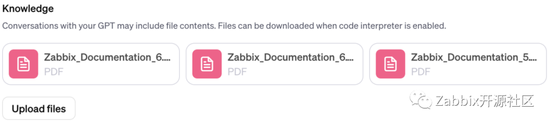 我们点击Knowledge下的Upload files,上传提前准备好的Zabbix API文档(这里上传的是由Zabbix官网下载的Zabbix 5.06.06.4三个主流版本的PDF文档)。