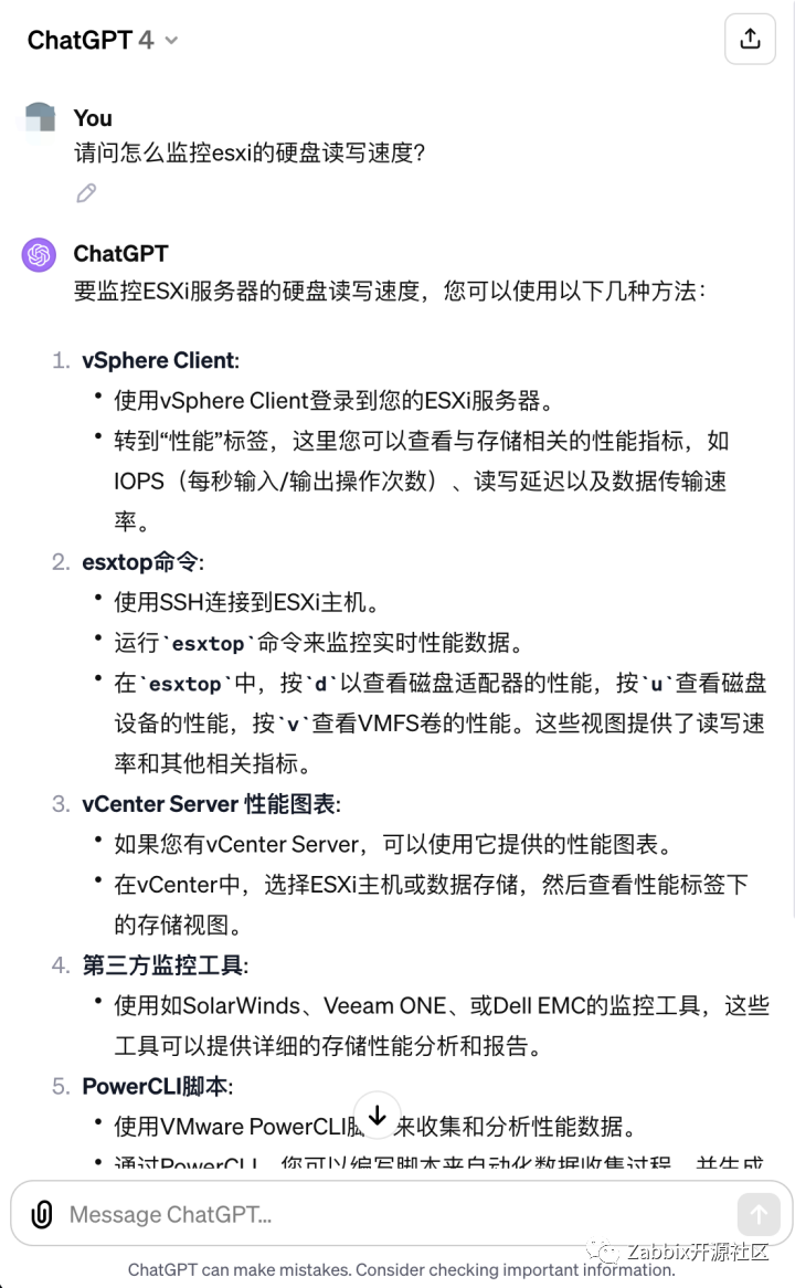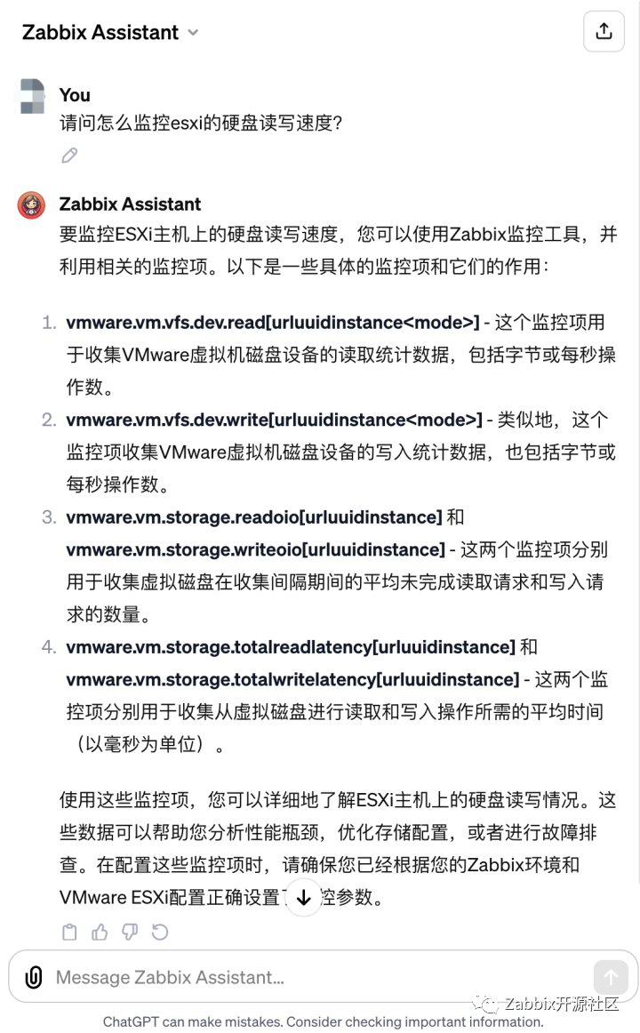 下面我们来测试一下投喂文档后的GPT。我们尝试询问它一个较复杂的问题,来看一看普通GPT4和我们的Zabbix Assistant的回答: