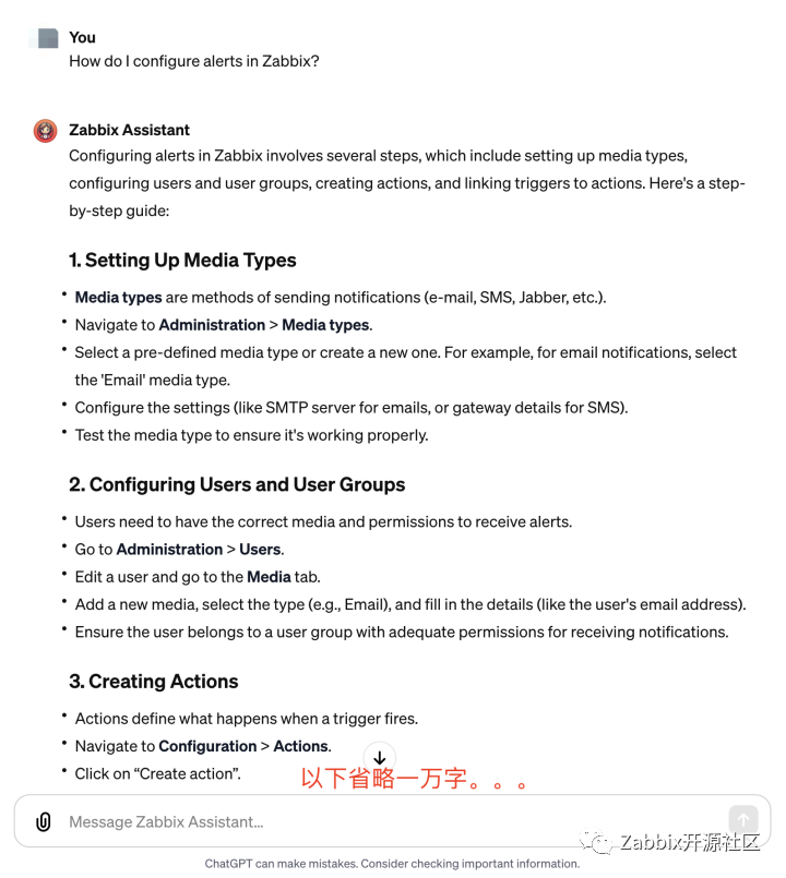 下面我们来简单测试一下Zabbix Assistant的能力。我们点击Zabbix Assistant的Conversation starters的第一个选项:How do i configure alerts in Zabbix?以下是它的回答: