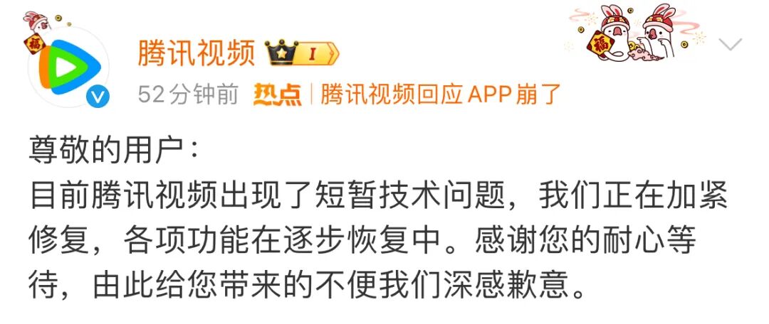 当晚9时许,腾讯视频官方微博发博回应:目前腾讯视频出现了短暂技术问题,我们正在加紧修复,各项功能在逐步恢复中。感谢您的耐心等待,由此给您带来的不便我们深感歉意。