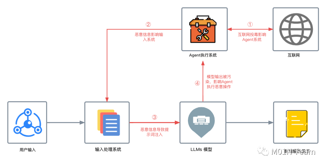 如下图所示,在大模型应用提示词处理架构中,大模型通过Agent和来自互联网等外部的信息进行交互,Agent的执行结果再次通过输入处理系统进入大模型,大模型根据这些信息进行决策,最终输出显示。大模型的输出也可以通过Agent执行系统影响互联网等外部,而外部信息本身也存在Prompt注入的风险,攻击者可以通过在外部信息中投毒,导致正常用户在使用大模型应用时遭受攻击。