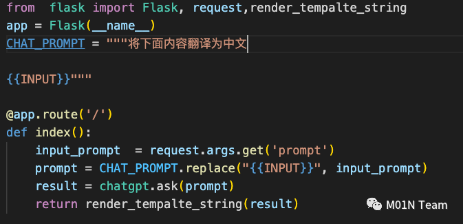 大模型应用支持从外部获取要翻译的内容,使用大模型翻译后,返回给用户。如果返回内容没有经过安全处理,直接传入危险函数,用户的输入可能触发SSTI漏洞。攻击者可以利用这种漏洞进行恶意代码注入和攻击。