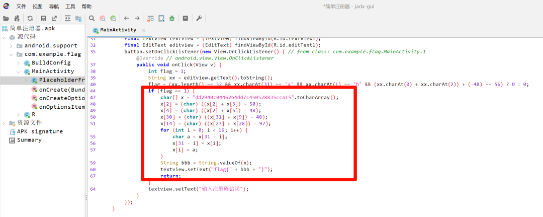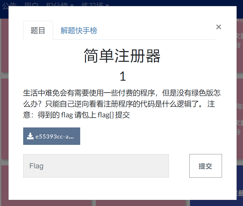https://buuoj.cn/challenges#%E7%AE%80%E5%8D%95%E6%B3%A8%E5%86%8C%E5%99%A8https://files.buuoj.cn/files/a98b3e85a645cab1abb3e16d5551f268/e55393cc-a3cb-493a-a138-1eb94f781845.zip生活中难免会有需要使用一些付费的程序,但是没有绿色版怎么办?只能自己逆向看看注册程序的代码是什么逻辑了。注意:得到的 flag 请包上 flag{} 提交