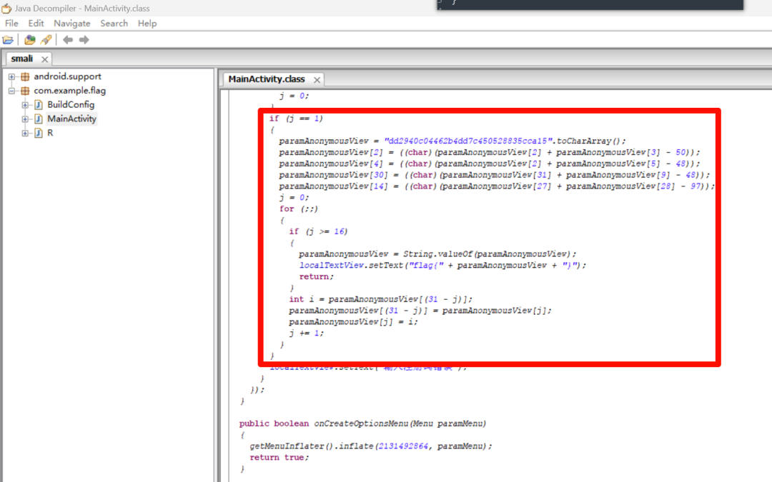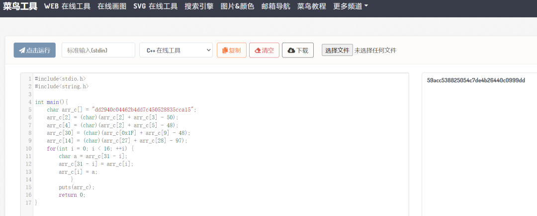 #include<stdio.h>#include<string.h>int main(){char arr_c[] = "dd2940c04462b4dd7c450528835cca15";arr_c[2] = (char)(arr_c[2] + arr_c[3] - 50);arr_c[4] = (char)(arr_c[2] + arr_c[5] - 48);arr_c[30] = (char)(arr_c[0x1F] + arr_c[9] - 48);arr_c[14] = (char)(arr_c[27] + arr_c[28] - 97);for(int i = 0; i < 16; ++i) {char a = arr_c[31 - i];arr_c[31 - i] = arr_c[i];arr_c[i] = a;}puts(arr_c);return 0;}