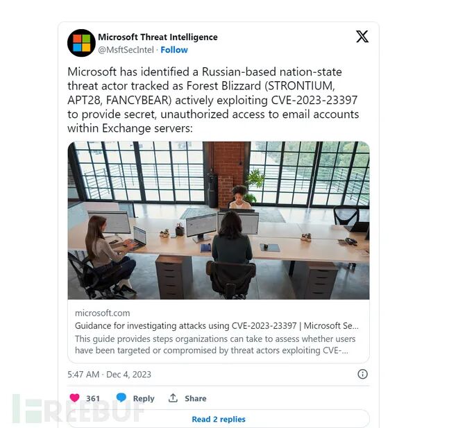 Bleeping Computer 网站消息,微软威胁情报团队近期发布警告称,疑似具有俄罗斯国家背景的网络攻击组织 APT28(又名 "Fancybear "或 "Strontium")正在积极利用 CVE-2023-23397 Outlook 漏洞,劫持微软 Exchange 账户并窃取敏感信息。
