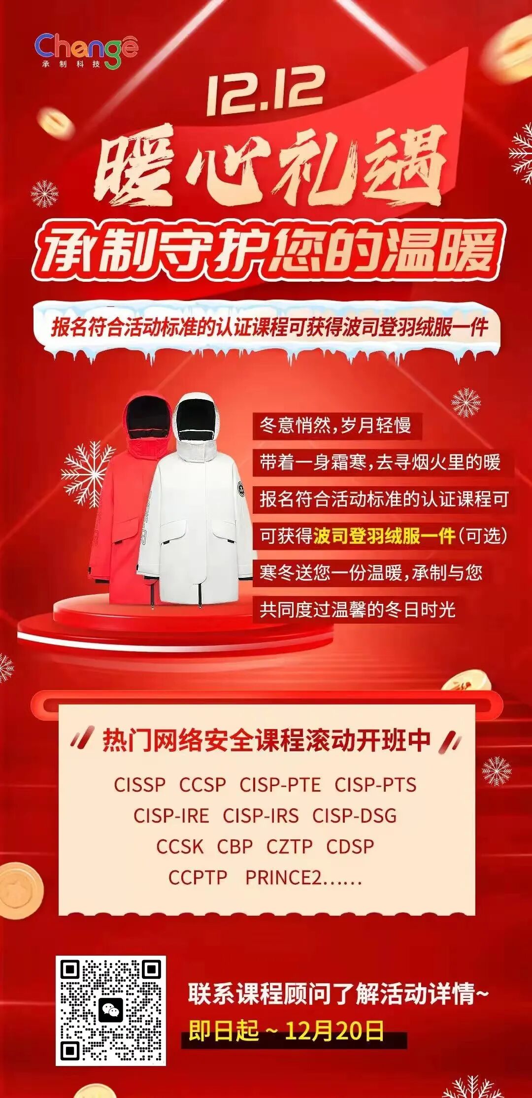 报名CISSP、CCSP、PTE、PTS、IRE、IRS、DSG、CCSK、CDSP、CZTP、ITIL4等符合活动标准的认证课程,可获得波司登羽绒服一件(可选)。