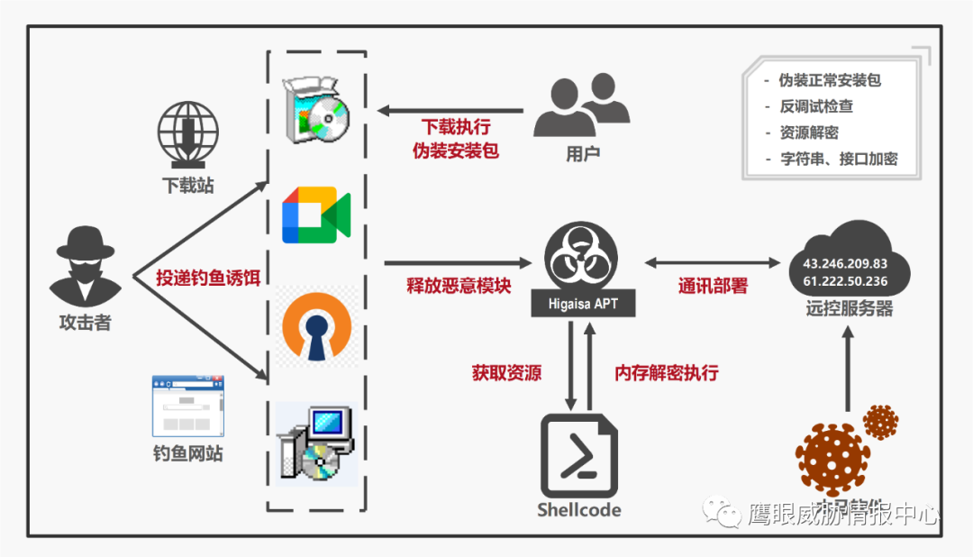 近日,毒霸安全团队发现了韩国Higaisa组织的多个钓鱼活动。据悉,Higaisa自2019年首次被公开披露以来持续活跃,其攻击目标多元化,涵盖政府机构、商业实体以及参与国际贸易的公司和个人。该组织常通过精心设计的钓鱼邮件和鱼叉式网络攻击手段来传播恶意软件,且其主要的恶意操作通过Shellcode执行,包括但不限于白加黑动态加载技术、代码解密机制、反调试措施,以及利用密钥加密技术来保护其通信数据。研究人员表示,Higaisa在近期活动中,主要通过将恶意模块与多个常规软件进行捆绑,再将它们伪装成如"PassGuard(密码卫士)"的正常安装包,然后借助钓鱼网站、下载站等途径诱导用户下载。一旦用户在本地设备执行这些看似合法的安装程序,隐藏的恶意模块便被激活并开始执行资源中的加密Shellcode。最终,攻击者还将建立一个加密通信通道,通过生成密钥,与C2服务器实现进一步的通信和部署。攻击链图如下图所示。