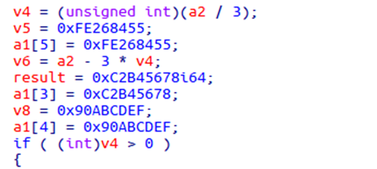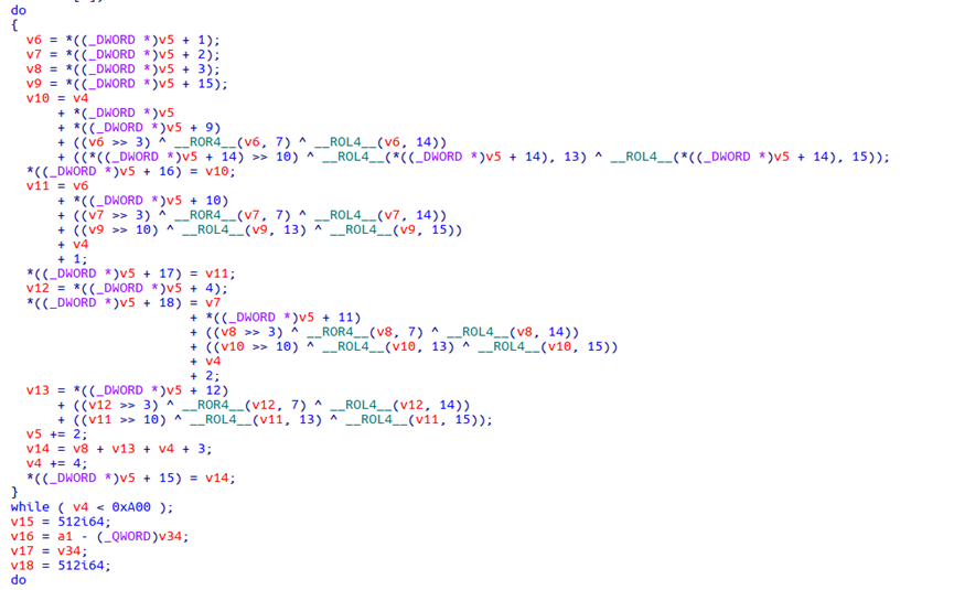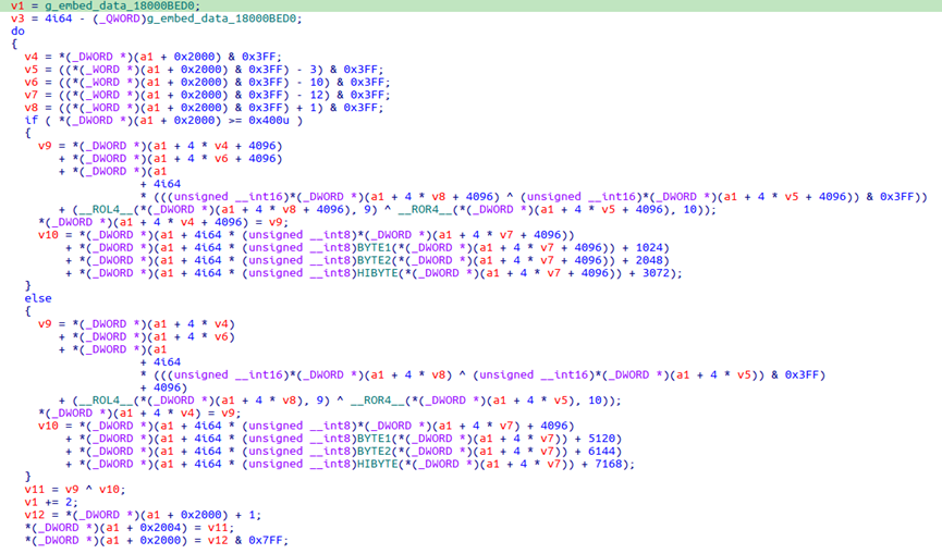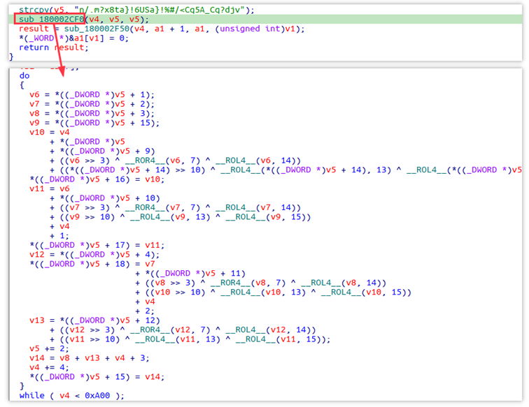 关联到的木马样本1c4227bf06121fe9c454a85ad9245b56在解密字符串时使用A5加密算法,其中常量0xFE268455,0xC2B45678,0x90ABCDEF也出现在Lazarus的历史攻击样本中[4]。